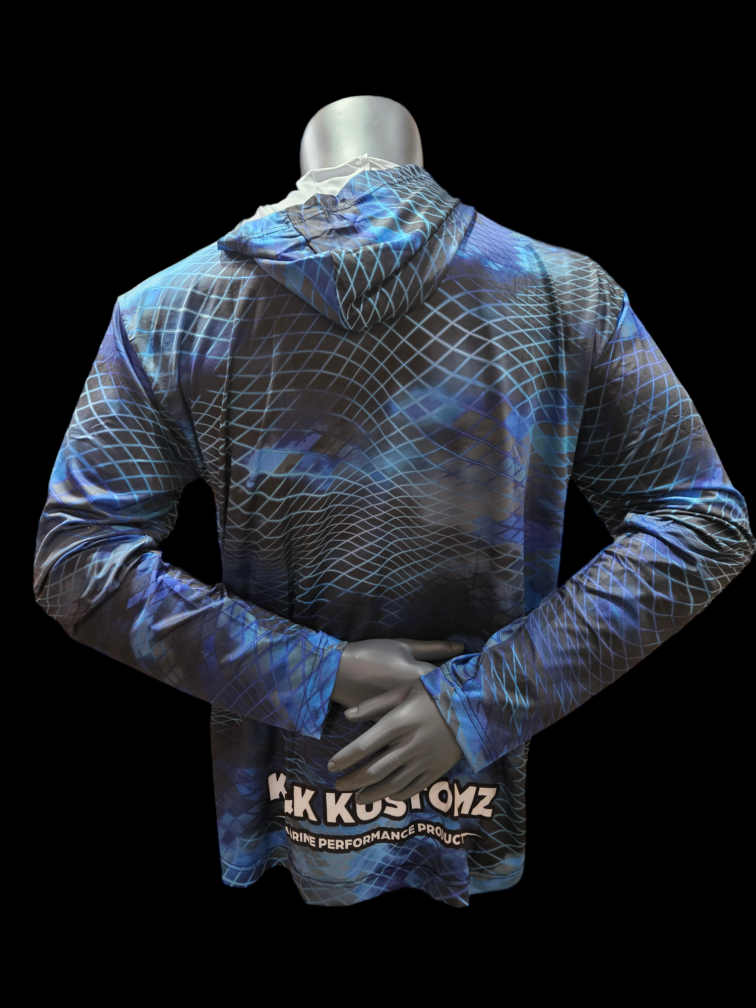 BlueThe K and K Kustomz hooded long sleeve sun protection hoodie is a standout on and off the water and has UPF 50 sun protection making it a great fishing shirt to protect you from the harmful effects of the sun's UV rays. This men’s long sleeve sun protection shirt features quick dry technology, moisture wicking material, and stain resistance. The K and K Kustomz lightweight performance fishing hoodie not only protects anglers from the effects of the sun's UV rays, but is also a long sleeve hooded shirt that will keep you fishing comfortably all day long and looking stylish while representing the K and K Kustomz brand.