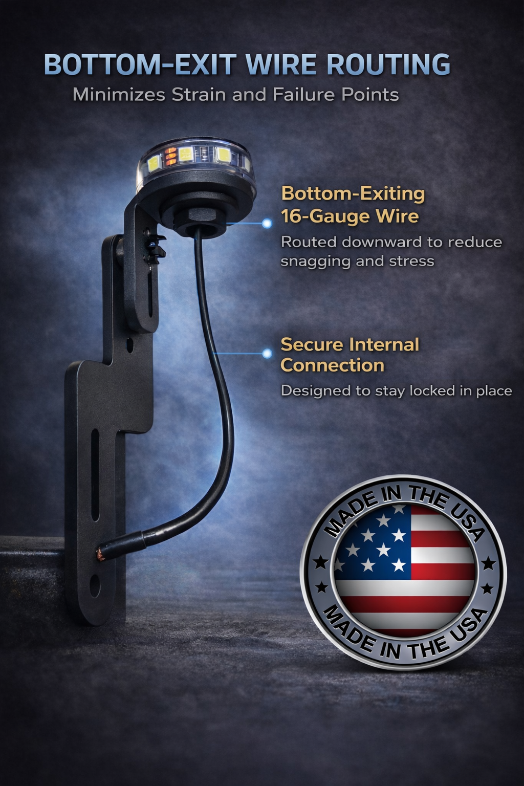The bottom exit wire design uses a heavier 16 gauge wire routed downward to minimize strain, reduce snagging, and eliminate pull out issues common with top exit designs.